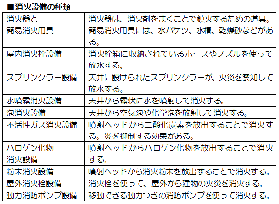 防火の対象となるものに応じて、設置する消火設備は異なります。