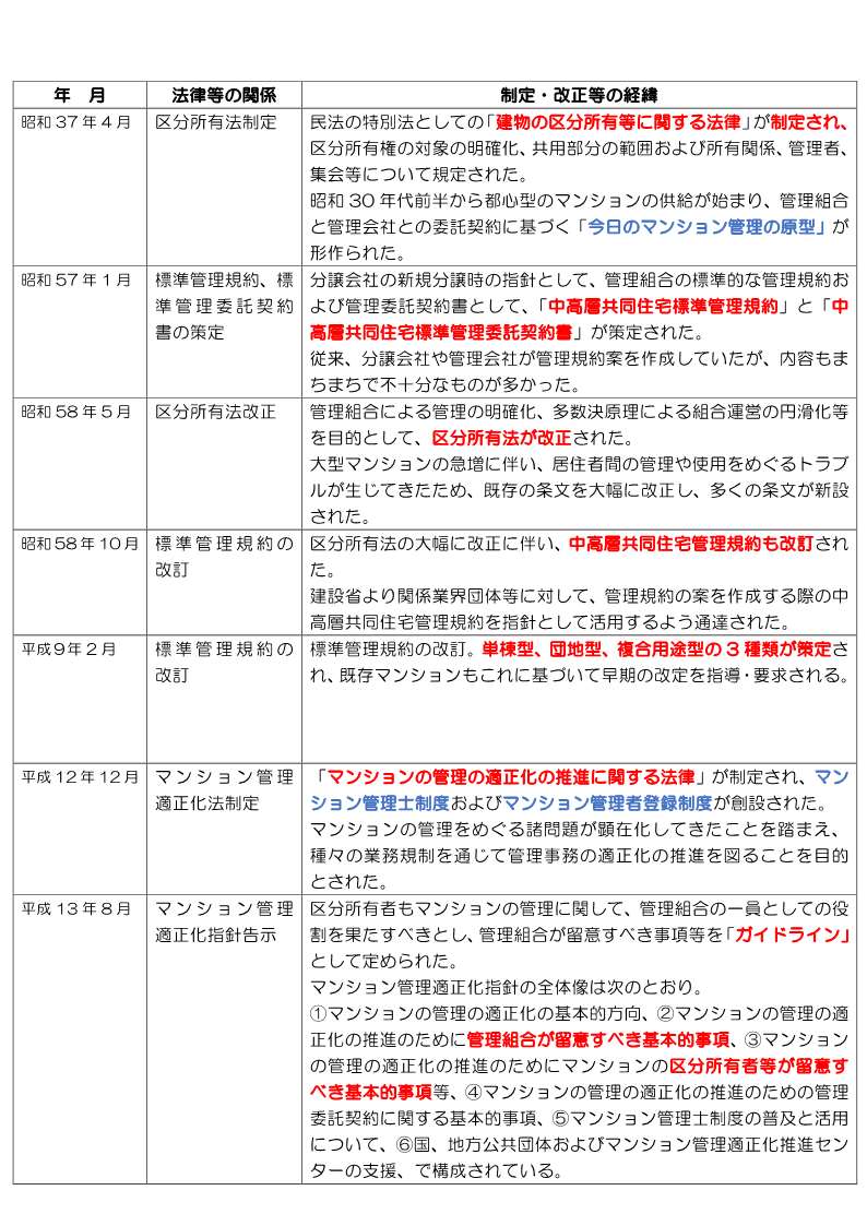 こういった時代の流れを理解する早道として、「マンションに関する法律等の制定・改正等の経緯」をまとめました。お役に立てれば幸いです。