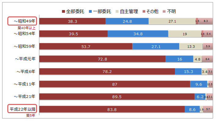 グラフから見てもわかるように昭和49年頃に竣工したマンション(築40年程度)では管理委託が63.1%、自主管理が27%ですが、近年に至ってはほとんどのマンションが管理委託をしているという状況になっています。