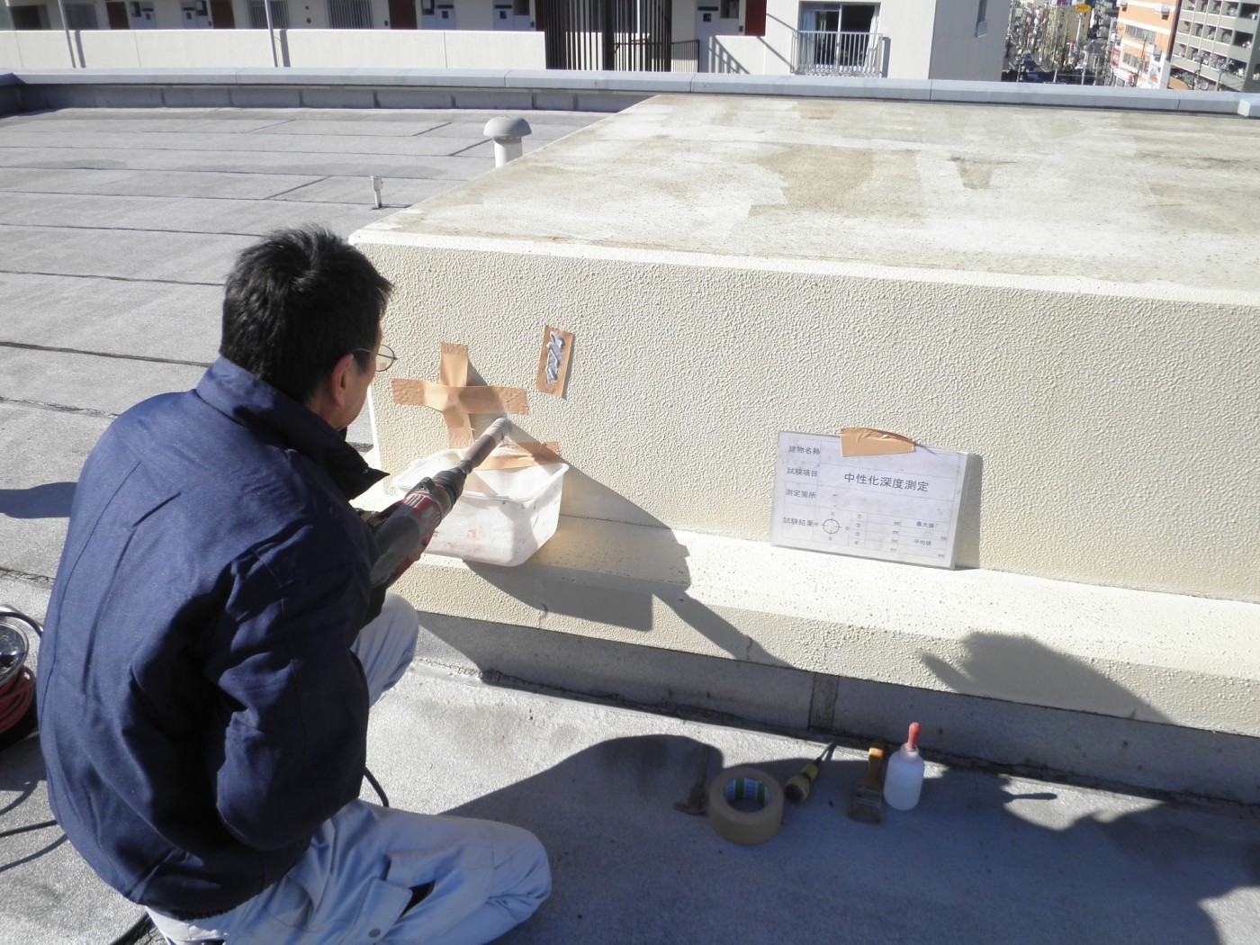 話は戻って、マンション建物劣化診断の中の調査について、少しご紹介します。今までのブログの中で何度か話の出ている”コンクリートの中性化”の試験です。