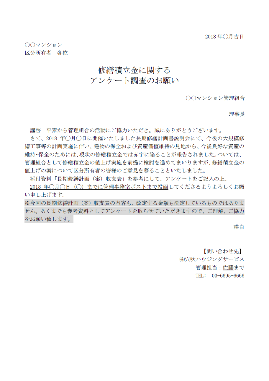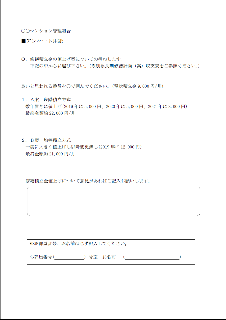 修繕積立金の改定案が用意できたら組合員にアンケートを取ると良いと思います。