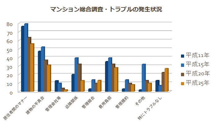 上のグラフはその調査の中のマンションで発生したトラブルの状況です。居住者間のマナーが平成11年から見ても最もトラブル件数が多くなっています。