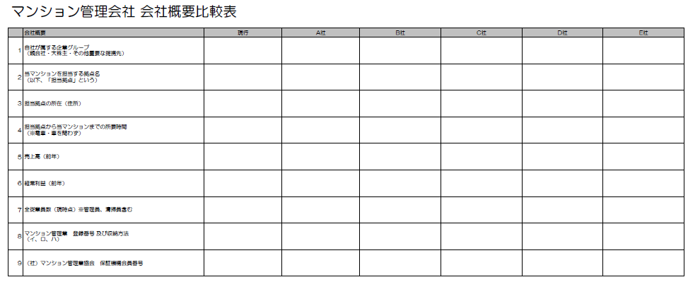 エクセルダウンロードはこちら → マンション管理会社 会社概要比較表