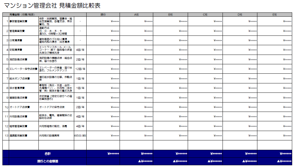 エクセルデータのダウンロードはこちら → マンション管理会社 見積金額比較表