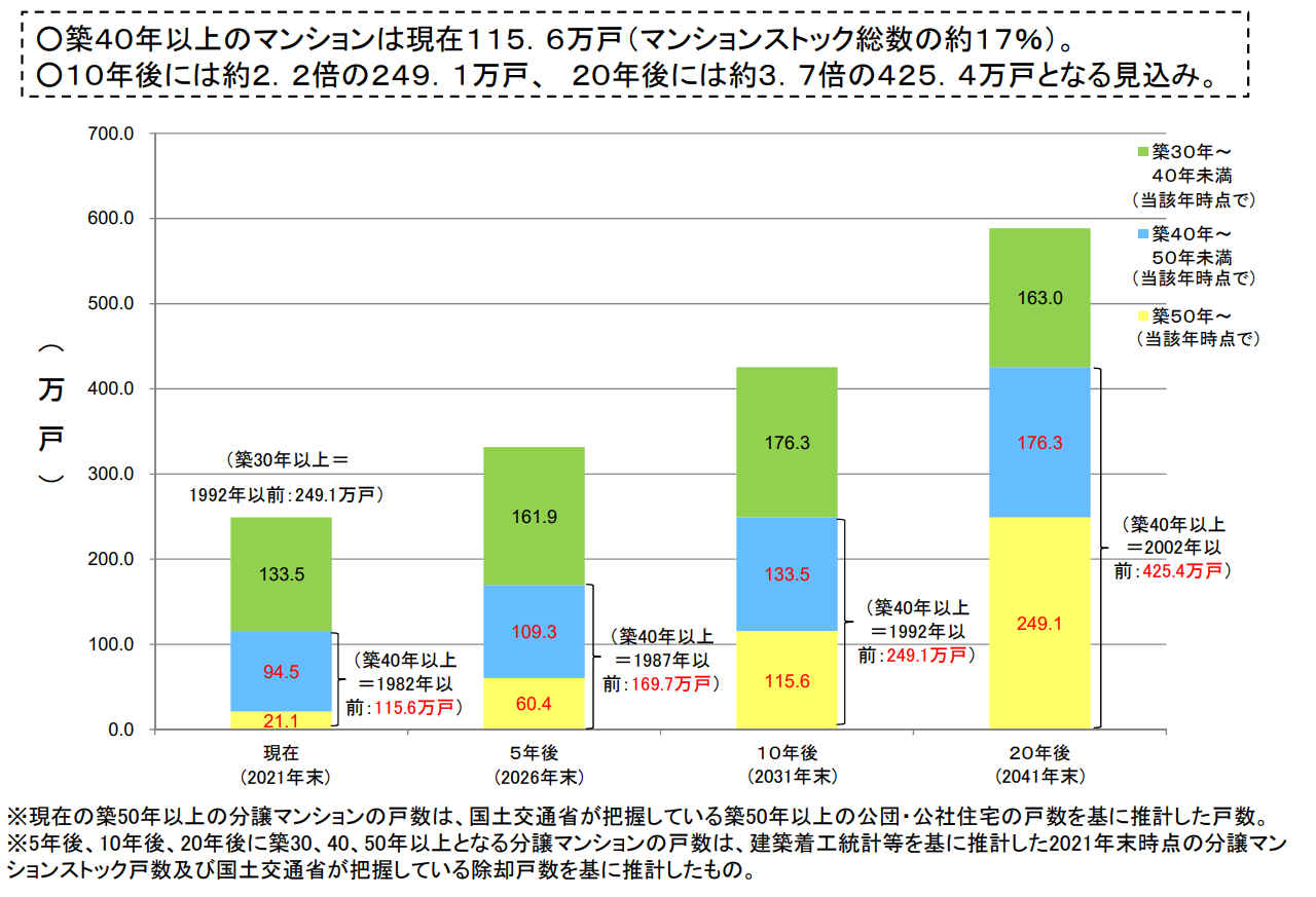 しかしながら、2021年末のデータでは築年数が40年以上のマンションが115.6万戸に上り、全体の1割以上を占める結果となりました。