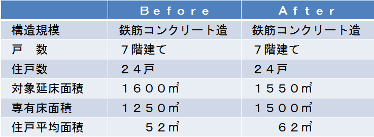 今回の事例では、戸数の増加はありませんでしたが、全体の専有床面積が増えたことから、1住戸を広く設定することができました。エリアも世田谷区の東急電鉄田園都市線の駅から徒歩圏内という人気・高級エリアということから、保留床の単価が高く設定できましたので、還元率が50%を超えました。