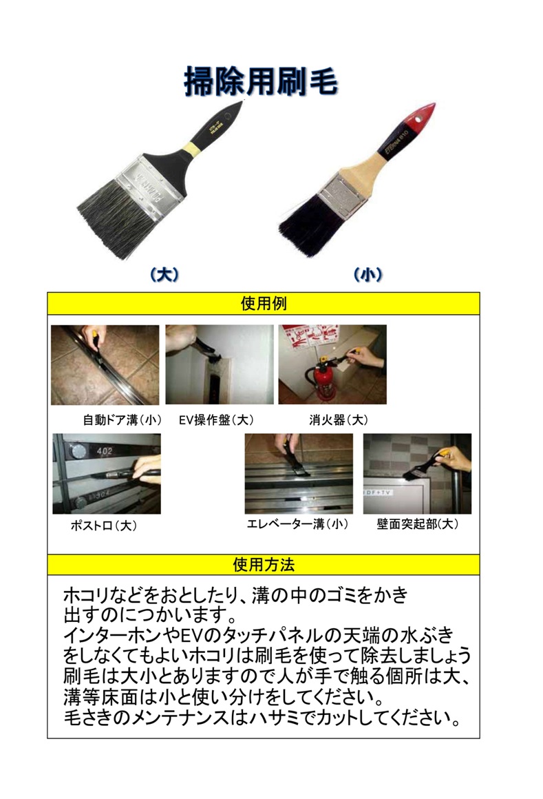 小さい刷毛は、溝などの床面の掃除用。大きな刷毛は消火器や壁面突起物の上部を掃くのに使用します。