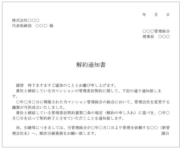 「マンション管理会社変更|9つのステップ⑤総会準備」の中で決めた、現行のマンション管理会社との契約解約日を書面にて通知しましょう。