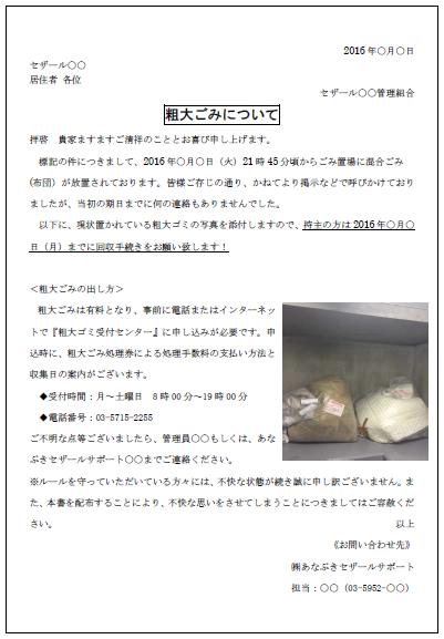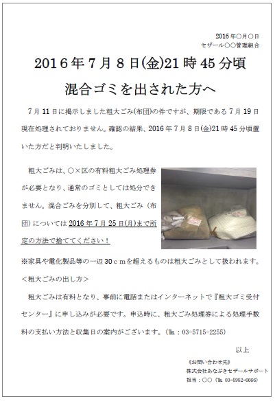 それでも対応がなされないときは、再度期限内に対応がなかった事を明記し注意文を掲示及び各住戸に配付します。