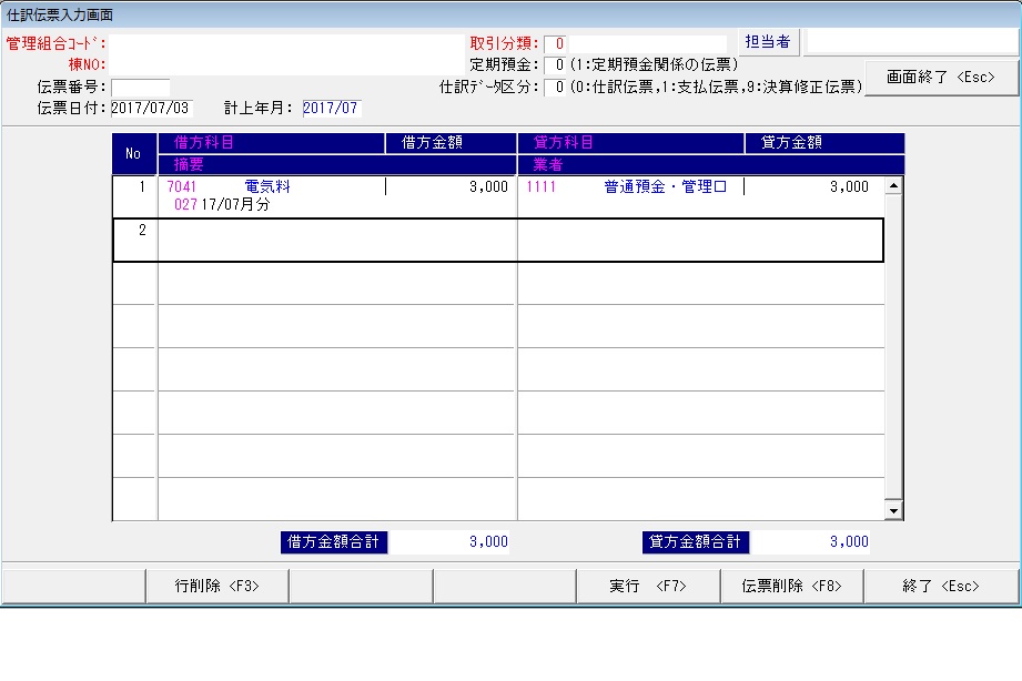 2017年7月3日に、普通預金から電気料3,000円支払ったという仕訳ですね。