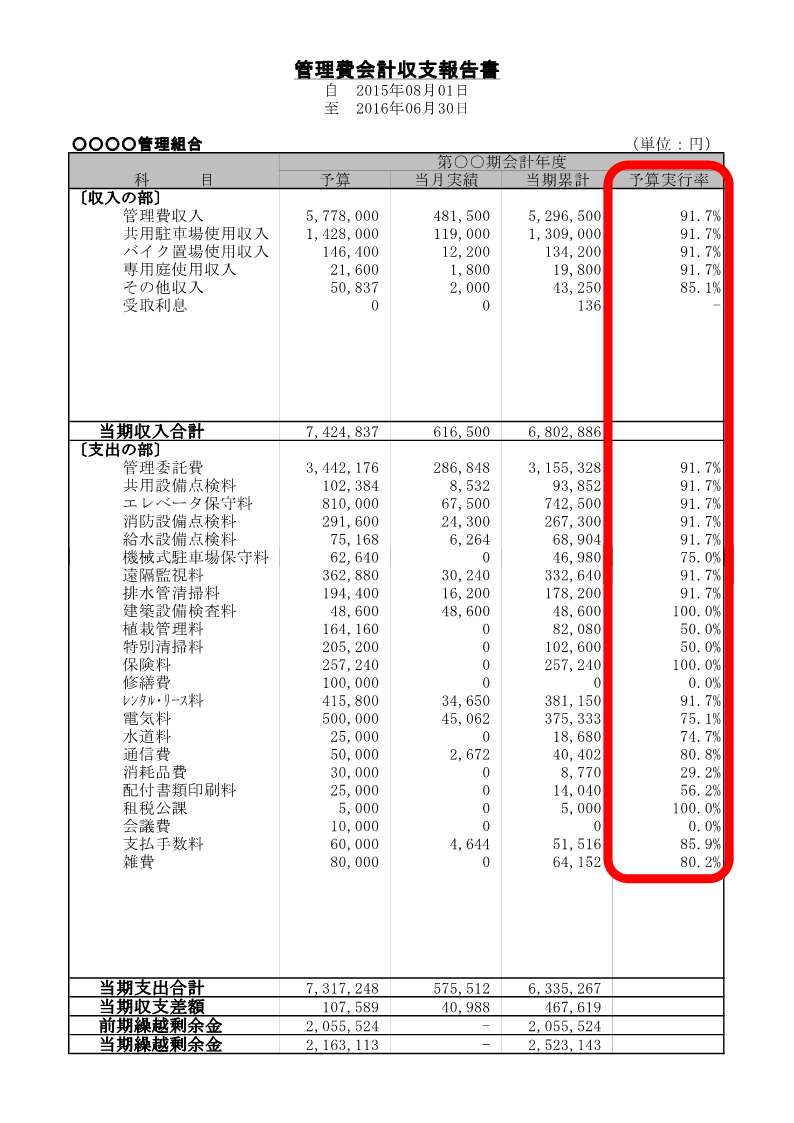 予算実行率は毎月定額発生するものに関しては、金額の変更がない限り均等に推移していきます。 この管理組合だと11か月目ですので毎月定額計上される管理費収入や管理委託料、レンタル・リース料等の予算実行率はすべて91.7%(12ヶ月を100%となるので100÷12ヶ月×11ヶ月=91.666…)となっています。同率の予算実行率になっているか確認しましょう。