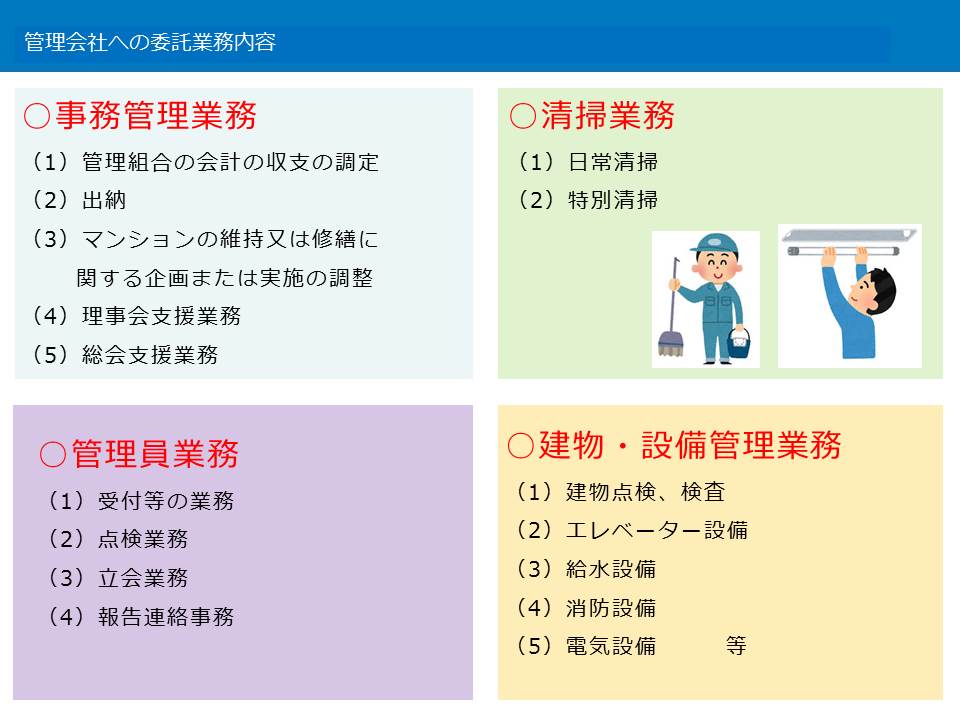 管理会社に委託できる仕事は大きく分けると以下の4つがあります。