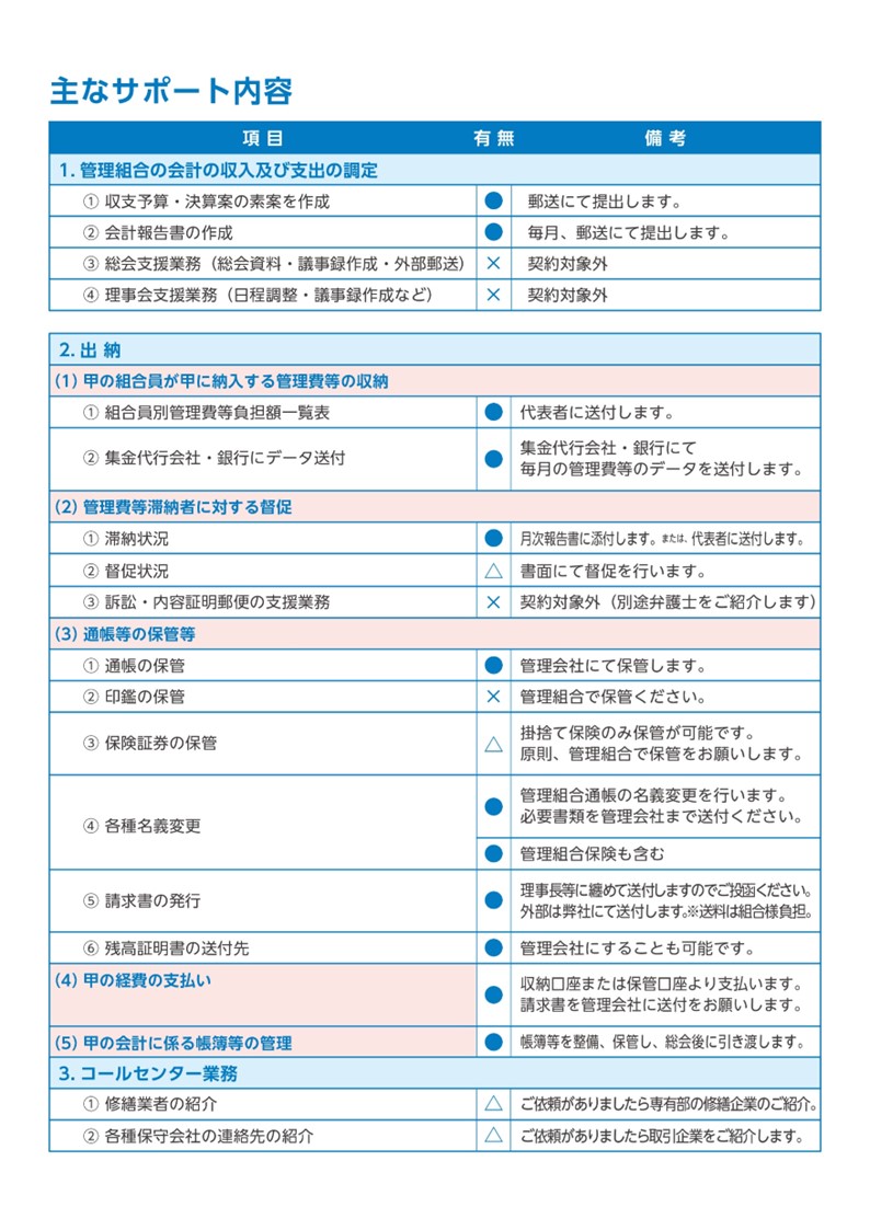 理事会、総会の運営などは問題なく進めることが可能でも会計業務の実施が困難になるケースがあります。 自主管理マンションのそういった問題点から、当社では会計業務のみを受託する『自主管理マンション支援プラン』といったプランを準備しています。