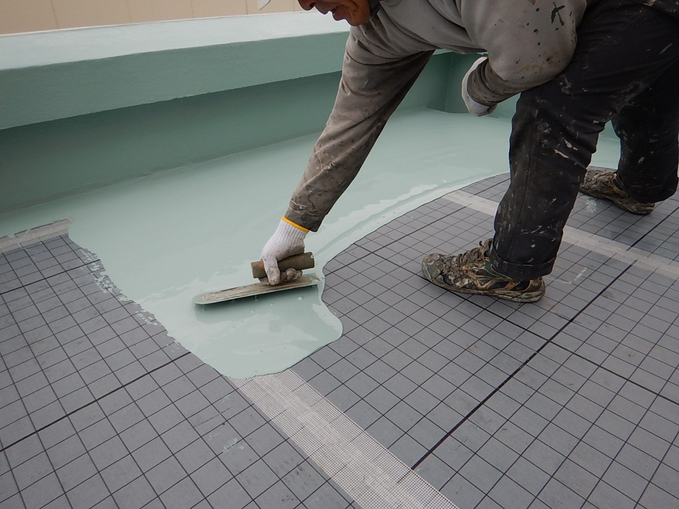 ゴム状の樹脂を塗り、全体的に樹脂の膜を作る工法です。