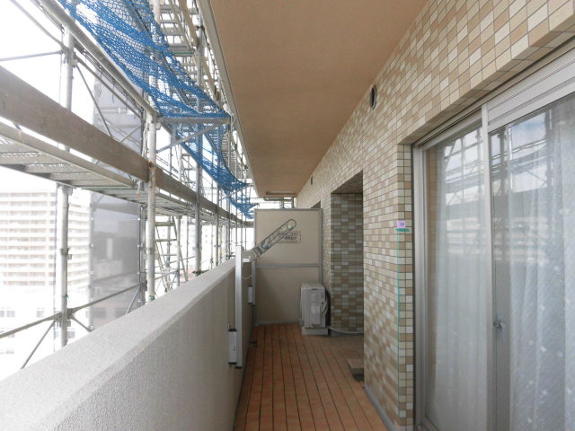 バルコニー内の工事では、天井・壁・雨どい等を再塗装の工事を実施いたしてまいりますが、工事着手前に水を高圧にて洗い流す高圧水洗浄をおこない、古い塗膜や埃を洗い流しますので、高圧水洗浄時は窓の隙間や小窓・換気ガラリなどから水が入らないようにすべて閉めてもらうことをお願いします。また、お部屋うちへ水が入り込んでしまう場合がありますので、用心のため、台風対策のように、窓下に乾いた雑巾や古タオルなどを敷き詰めておくことをお勧めいたします。