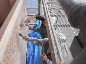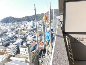 バルコニーの外での作業となりますが、足場を組み立てる際、手摺壁等に足場の控えを取り付ける際にドリル穿孔を行いますので、粉じんほこりが舞い、洗濯物に埃がかぶりますので、洗濯物を控えていただくようお願いをしています。