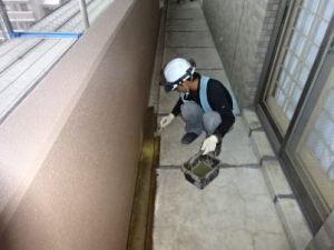 バルコニーの溝部分に防水加工を施す作業をいたしますので、作業員が立ち入って作業をいたしますので、バルコニーへの出入りが制限されてしまいます。