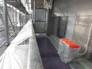 このタイミングでバルコニーでの洗濯物干しができなくなります。これはペンキ類が衣類に付着することを防ぐ意味もありますので、ご理解をいただきたく思います。