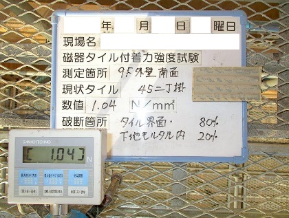 現場施工時のタイル「0.4N/㎟」以上の 数値が得られ、かつ、界面(タイルと下地等の接している境界面)破壊率が規定値以上であれば「現状磁器タイルと下地の接着状態」は「良好」と判断されます。
