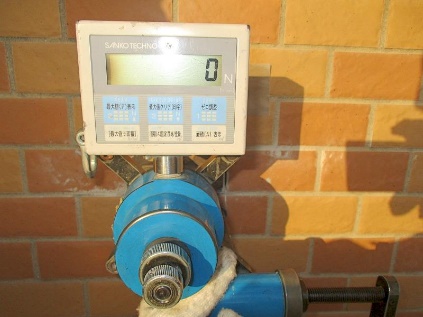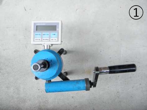 ③接着剤硬化後、「油圧式引張試験機」を「鋼製アタッチメント」にセットして引張り、試験面の強度を測定します。