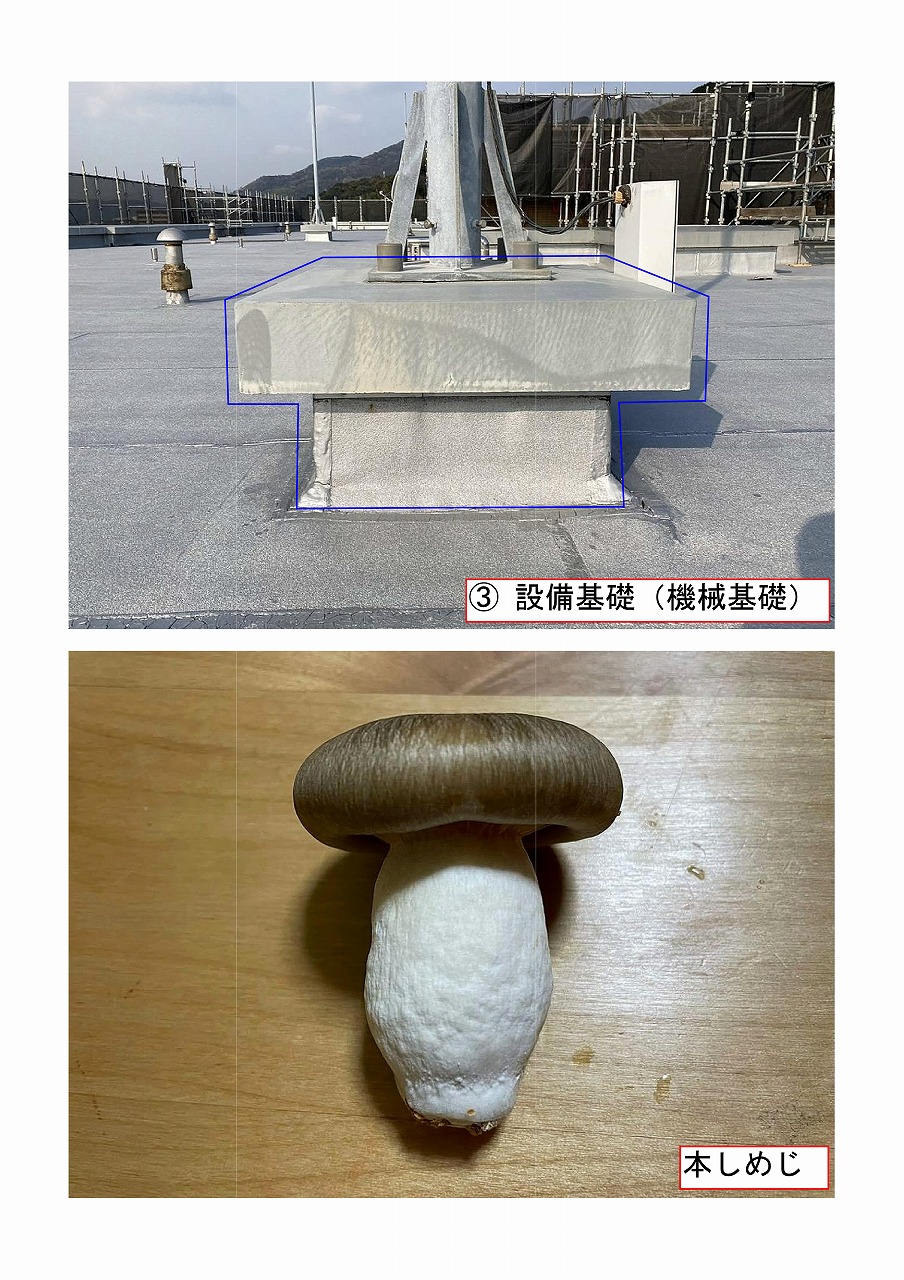 設備基礎(機械基礎)は、設備機器などの重量物を設置する際、防水層を傷つけることなく設置するためのものです。屋上などにアンテナ設備や消火補給水槽、その他設備を設置する場合の設置台のことを設備基礎(機械基礎)といいます。