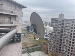 例えばマンションの外壁にCS・BSアンテナが空中に向かって設置されていると直接仮設の資材に干渉して組立工事が進められなかったり、大規模修繕工事期間中の汚損破損に繋がります。CS・BSアンテナは直接仮設工事前にお片付け頂き、大規模修繕工事中は休止のお手続きをして頂くことで、CS・BSの契約料の削減になります。直接仮設解体後にはCS・BSアンテナの契約会社に再開のお申し出を頂くと復旧対応して貰えることが一般的です。
