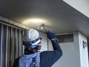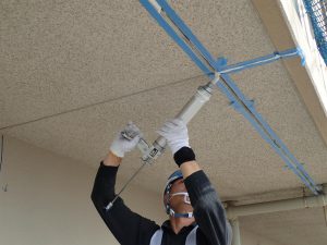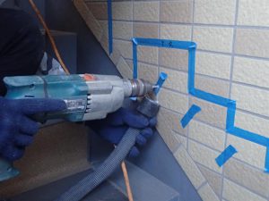 この壁繋ぎは電動ドリルを用いてマンション外壁に穴を開け固定専用アンカーを打ち込み、そのアンカーに壁繋ぎ部材を取り付けて直接仮設を固定します。この作業時に発生するのが、粉塵と騒音と振動です。