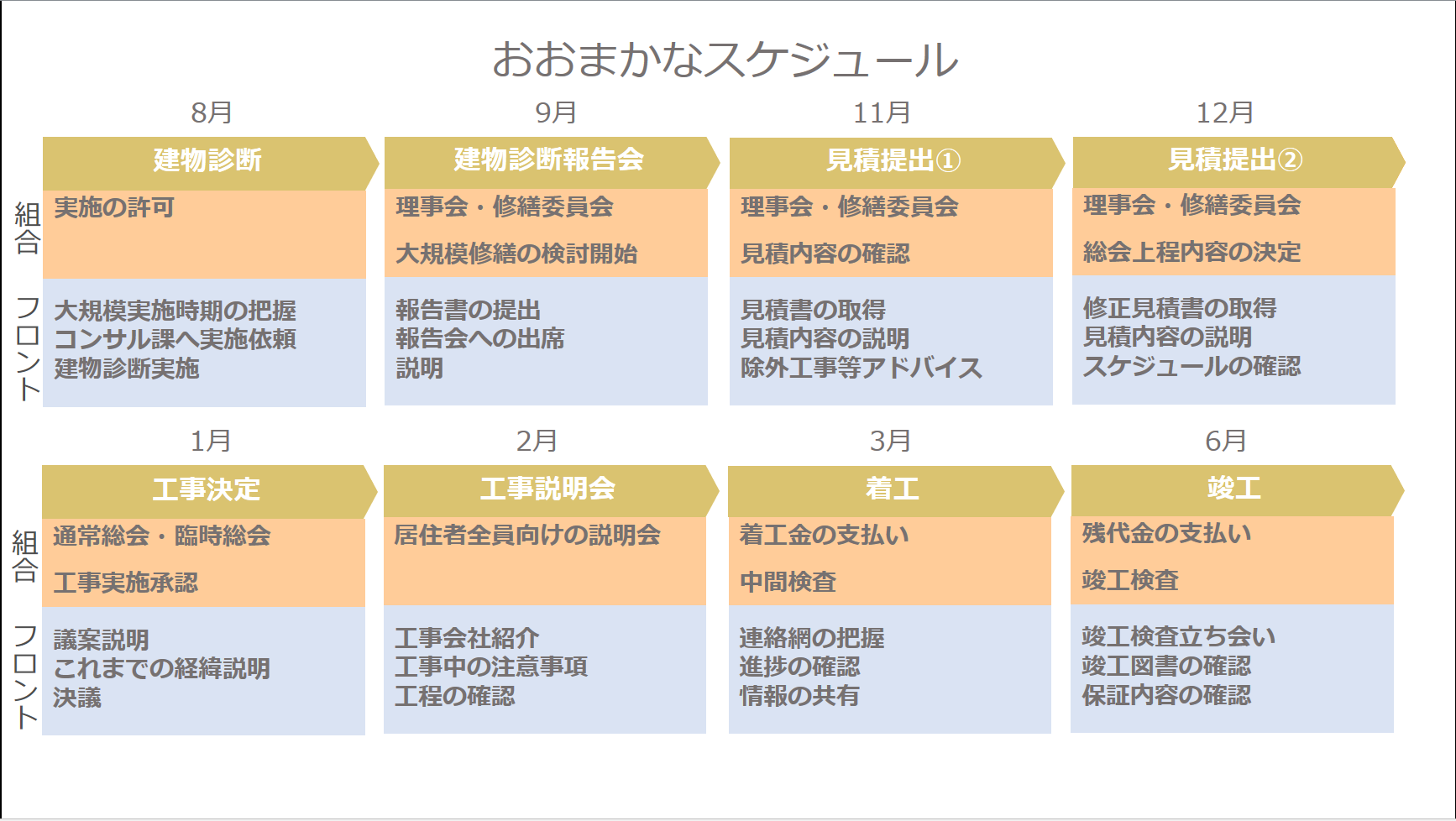一つの計画がずれてしまうと、後の計画もすべて後ろ倒しになってしまうので、スケジュール管理を確実に行い、マンションにお住まいの方や工事会社との連携を密に行うことが大切になります。