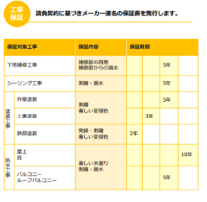 ※各保証内容にそって保証の範囲内であれば、無償にて補修が行われます。但し、工事完了後の経年劣化や日常生活での故障(例えば不注意等で傷をつけてしまったなどなど)、施工対象外の不具合については有償での補償になる事が通常であり、管理組合様と施工業者にて有償・無償の範囲を協議します。