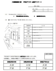 ※バルコニー点検アンケートは各居住者と施工業者が直接連絡を取り、補修工事日時を打合せし対応を行います。