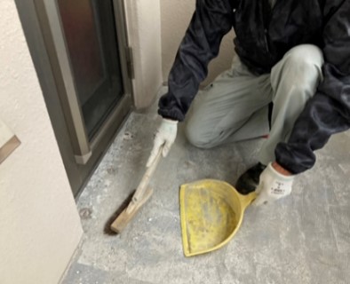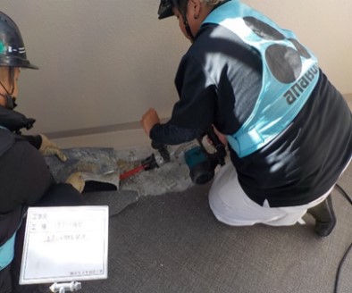 撤去残りがないか、既存接着剤が残っていないか、コンクリート面を傷めてしまってる箇所はないかを確認します。清掃もしっかりと行います。