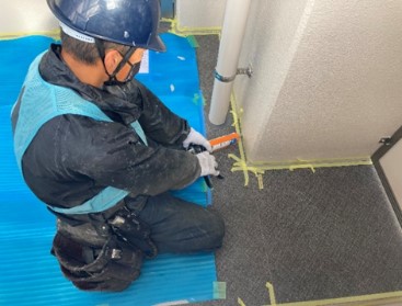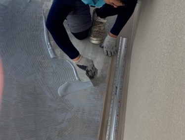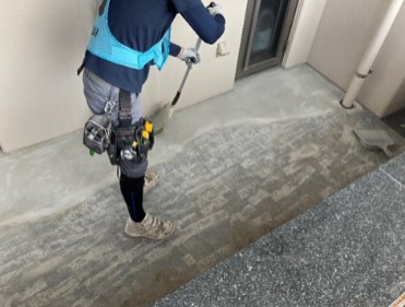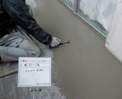 撤去後の床は、傷がついてしまっている箇所があります。そういった部分にそのまま長尺シートを張ってしまうと、表面が凸凹になったり、雨降りの時には水溜りになってしまったりします。それを防ぐために左官屋さんにモルタルで平滑に補修及び、勾配不良の箇所はかさ上げをして水溜りになる箇所を解消します。