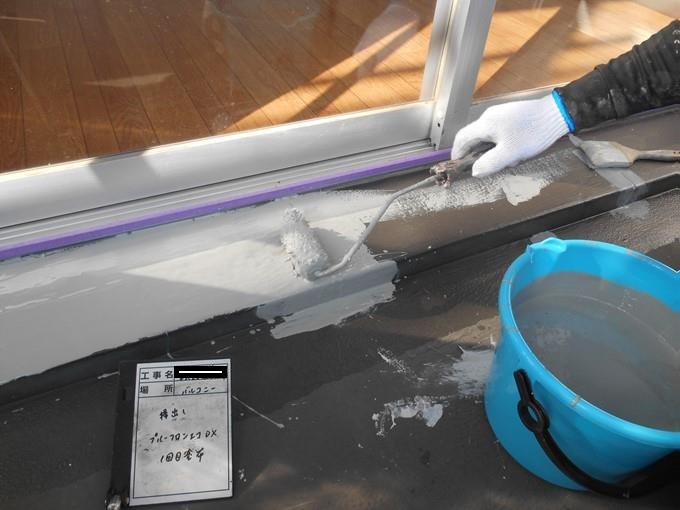 最初にプライマー(接着材)を塗ります。その上からウレタン材を塗りかけます。必要とする膜厚が各メーカーの工法毎に異なるため、塗る回数はその都度違います。平均的に屋上パラペットなどは2回塗り。バルコニー、廊下の排水溝は1回塗りです。