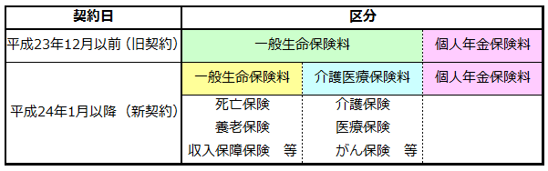 生命保険料控除は、契約しているすべての保険料の合計額が控除されるわけではありません。契約日と契約している保険の種類ごとに区分され、それぞれの保険料区分ごとに控除額が計算され、控除できる金額の上限枠も決まっています。では簡単にその区分を下の表で確認してみましょう。