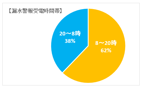 漏水警報のご相談を頂く時間帯として「20時~8時」の夜間・早朝の時間帯が全体の約4割を占めています。突然の発報に、日中の時間帯でも慌ててしまいますが、夜間・早朝の時間帯では不安も倍増してしまいます。「漏水警報」発報時は落ち着いて下記の手順を参考にご対応ください。