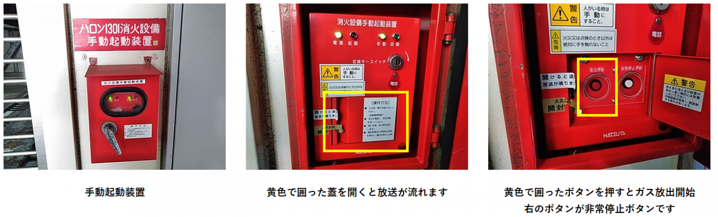 「火事です。火事です。消火剤を放出します。危険ですので避難して下さい。」と放送が流れます。