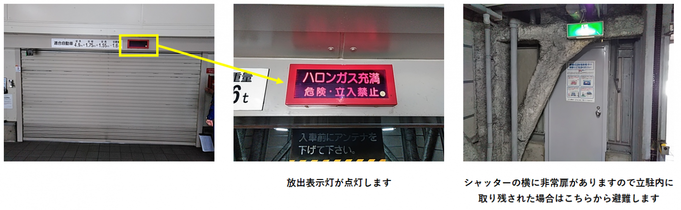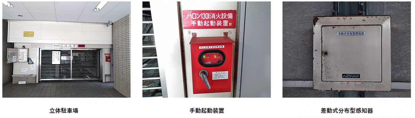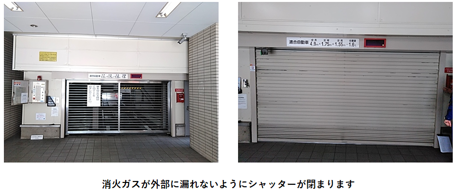 一般的には立体駐車場など常時人がいないところは「不活性ガス消火設備」「ハロゲン化物消火設備」のガス系消火設備が設置してあります。