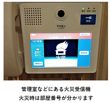 住戸内で火災が発生した場合はまず女性の声で「火災感知器が作動しました確認して下さい」と室内のインターホンが鳴動します。