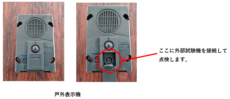 基戸外表示機に外部試験機を繋いで電気信号を用いて感知器が正常であるかを確認します。