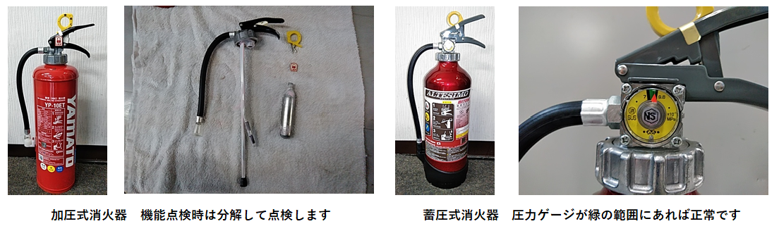 加圧式消火器は消防設備点検時に分解して内部の点検が可能ですが、蓄圧式消火器は内部に圧力が掛かっている状態なので分解してしまうと再び圧力を掛ける必要があるので消防設備点検時には実施出来ません。