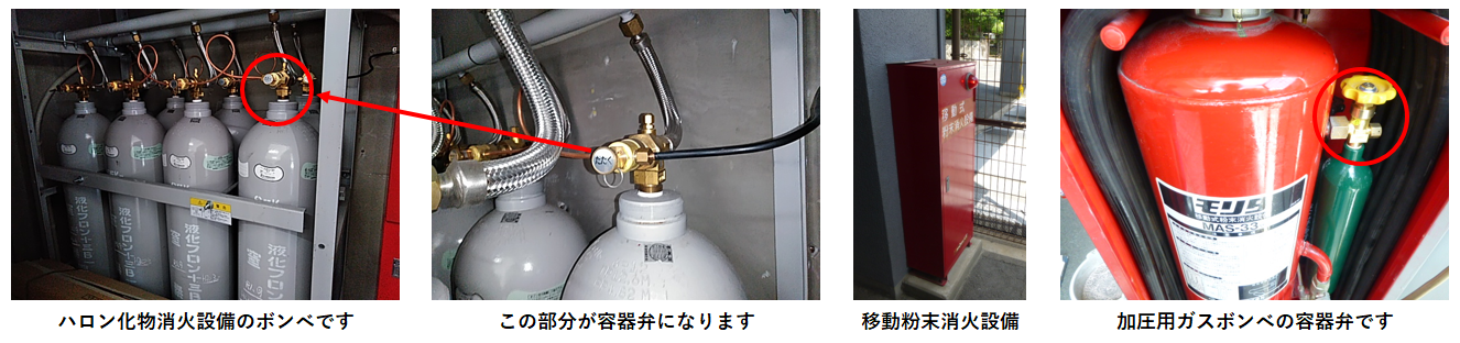 皆さんが一番目に付く設備としては移動粉末消火設備の加圧ガスボンベなどが該当します。