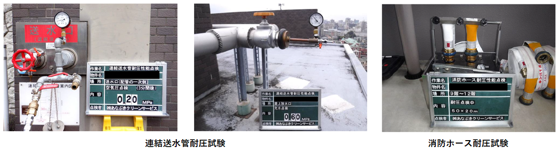 火災発生時に連結送水管を使用する際に配管に穴が開いていて消火活動に支障が出る事を防ぐ為や配管の経年劣化の状況を把握する為にも必要な試験となります。
