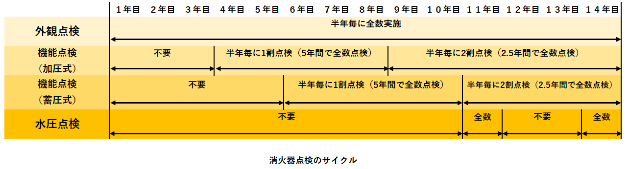 加圧式消火器は製造から4年目、蓄圧式消火器は製造から6年目から機能点検の対象となります。
