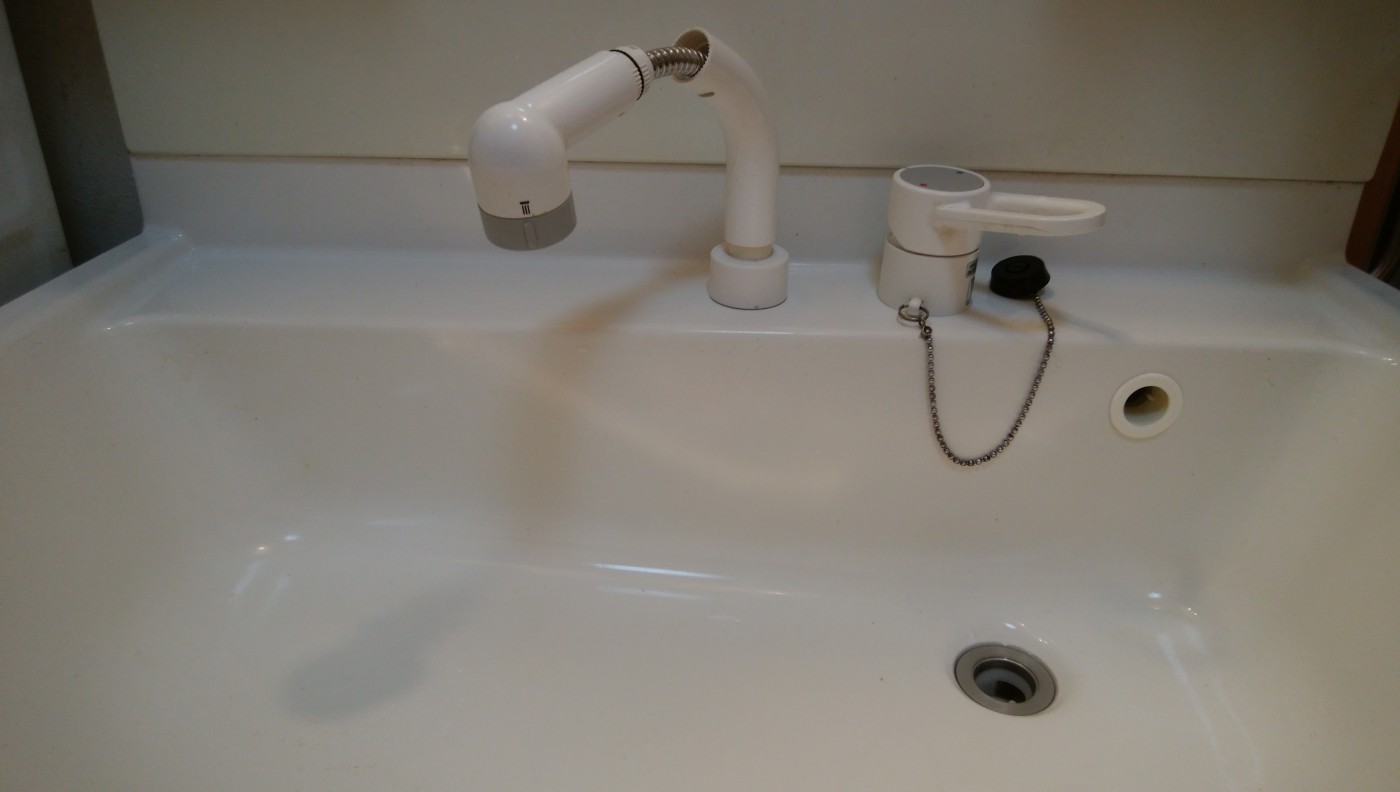 ① 写真の様に、洗面台のシャワーを使用すると、ホースを伝って水が洗面台の下に流れていきます。