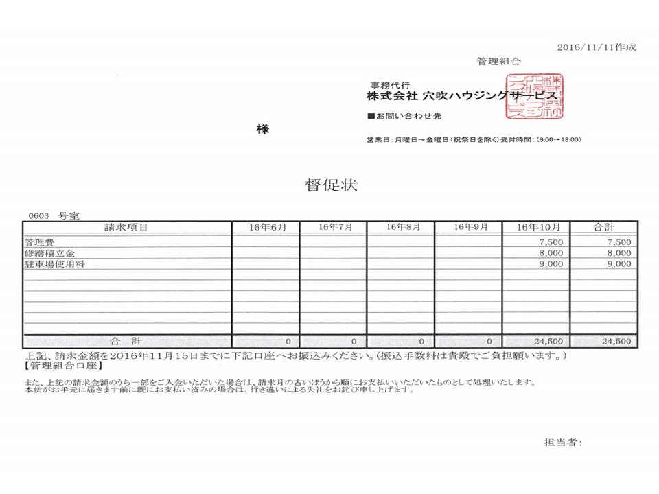 あなぶきハウジングサービスでは、滞納があった場合は1ヶ月目から、自社運営のあなぶきコールセンターからのお電話や書面送付、また訪問などによる督促業務を行っている他、長期滞納者には、内容証明郵便による督促を行いますので、滞納されている方が驚き、コンタクトが取れることもあります。