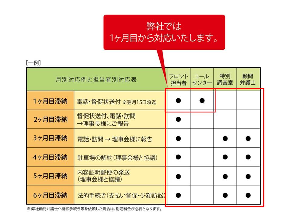 近年、管理費等の滞納問題は増加傾向にあります。しかしながら、望んで滞納している方はおられないはずですので、早期に話し合いの場を設け、理事会・滞納されている方双方の立場にそった解決案を提案することが、早期解決のポイントであると考えています。