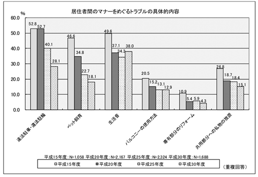 国土交通省が一定期間で行っている「マンション総合調査」ではトラブルについて、『話し合いによる解決』が一般的で、平成15年の調査では約80%が住民同士の話し合いで解決されたと報告されています。