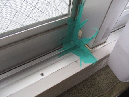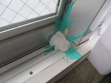 まず、引き違いサッシを閉めた状態でマスキングテーブを張ります。その上にエアコン用のスリープパテを埋めます。テープだけでは雨でテープが剥がれますので、パテ埋めをすることでマスキングテープに付着し、サッシレール廻りも含めてパテで厚みをつけて埋めることで水の浸入が防げます。