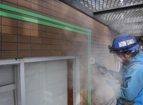 外壁サッシ廻りからの漏水は、タイルとコンクリート壁の隙間に浸入した水の流れを遮断するため、タイルをカッター切りしてタイル撤去後、シールを充填する方法を取ります。