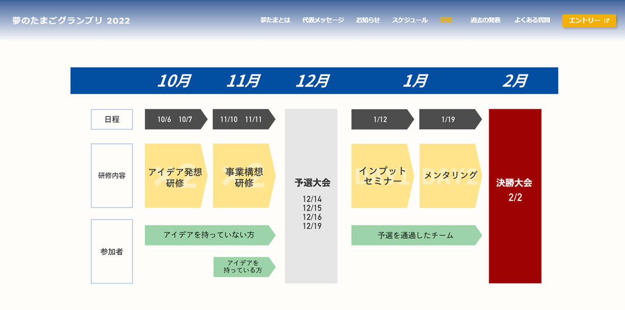 10月中・・・夢たまエントリー、新規事業立案のための研修参加(任意)、テーマ決め、テーマ発表